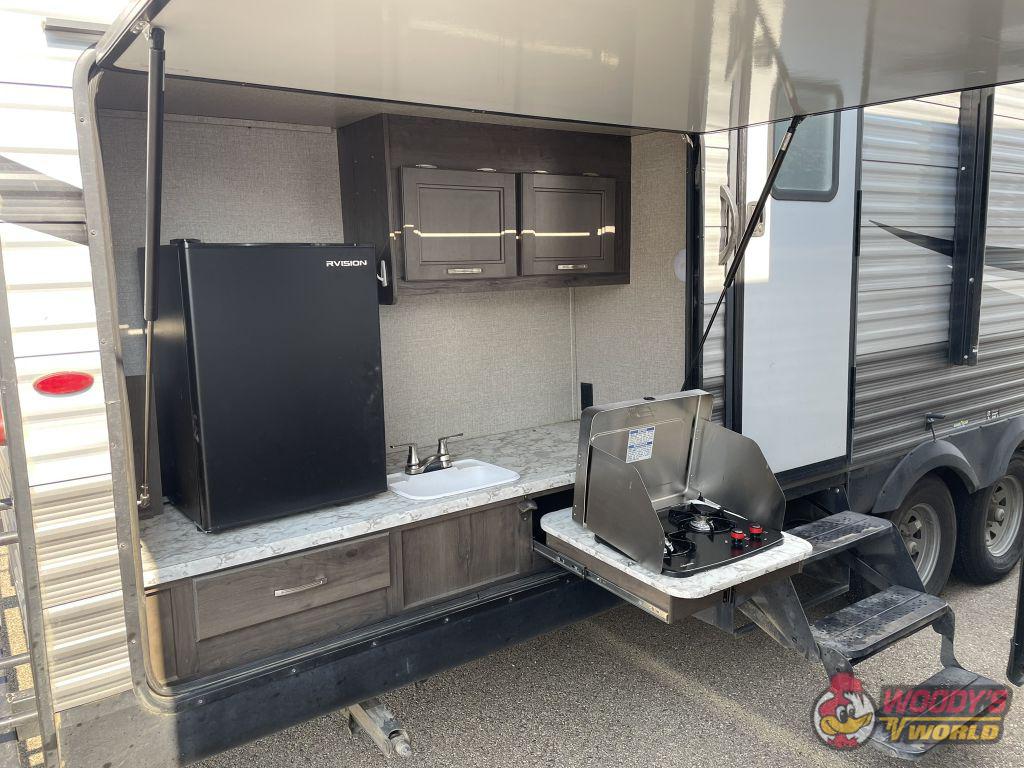 Step inside and discover a thoughtfully designed interior that boasts a cozy living area, complete with a plush sofa and a dinette that easily converts into extra sleeping space. The well-equipped kitchen features a refrigerator, microwave, and a three-burner stove, making meal prep a breeze. You'll love the convenience of the private master bedroom with a queen-sized bed, while the bunkhouse at the rear provides a fun and comfortable space for the kids or guests. With a total sleeping capacity of up to 10 people, this RV ensures everyone has a place to rest.
