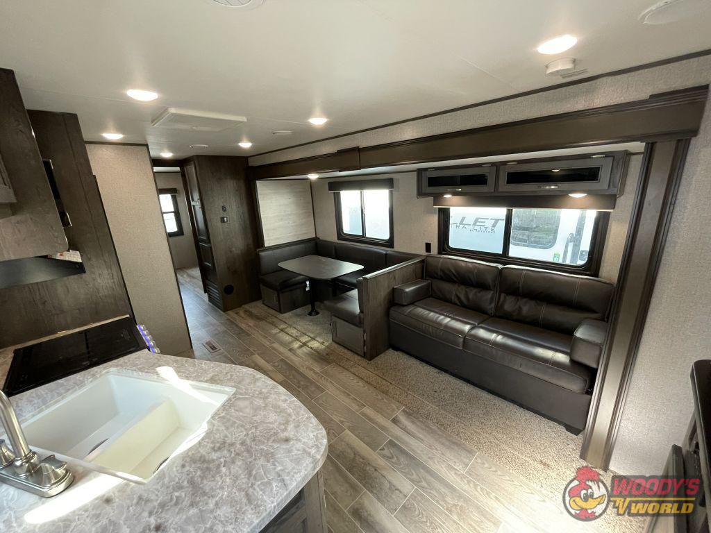 The JAY FLIGHT SLX 324BDS also includes a full bathroom with a shower, sink, and toilet, ensuring you have all the comforts of home wherever you go. Outside, enjoy the electric awning with LED lights, perfect for evening gatherings or simply relaxing in the shade. With a dry weight of approximately 3,300 kilograms and a payload capacity of around 1,000 kilograms, this travel trailer is both sturdy and easy to tow. Don't miss out on the opportunity to own this fantastic RV—your next adventure awaits!