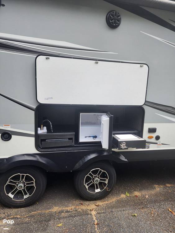 Inside, you'll find everything you need for a comfortable trip. This RV can sleep up to six people, making it ideal for family vacations or a getaway with friends. The layout is thoughtfully designed to maximize space and functionality. The rear kitchen is a dream for any camp chef, equipped with modern appliances and plenty of storage. The living area is perfect for relaxing after a day of exploring, with comfy seating and entertainment options to keep everyone happy.