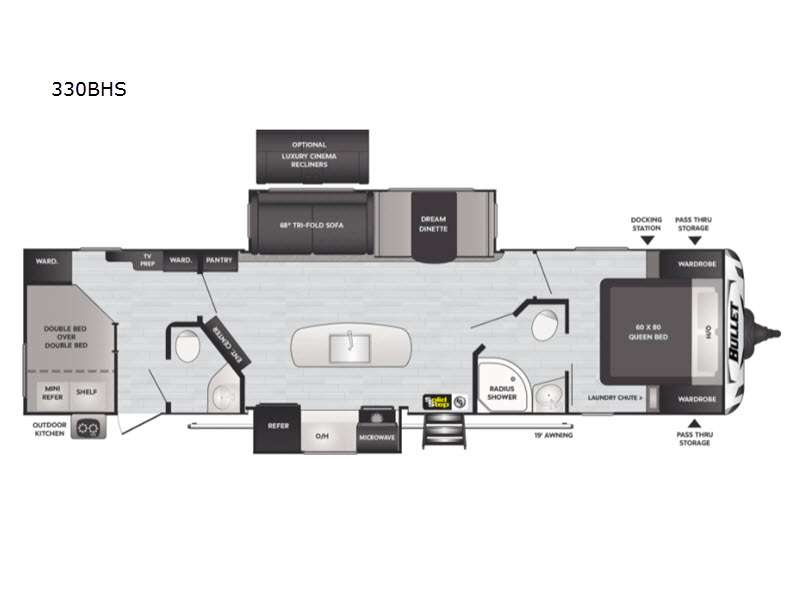 The Bullet 330BHS features two slide-outs, significantly enhancing the interior space to provide a roomy and inviting atmosphere. It comfortably accommodates up to nine people, making it ideal for family vacations or group outings. The intelligently designed floor plan includes a private master bedroom, a cozy bunkhouse, and a convertible dinette, ensuring everyone has a comfortable place to rest. The modern kitchen is equipped with top-of-the-line appliances, allowing you to prepare meals with ease while on the road.