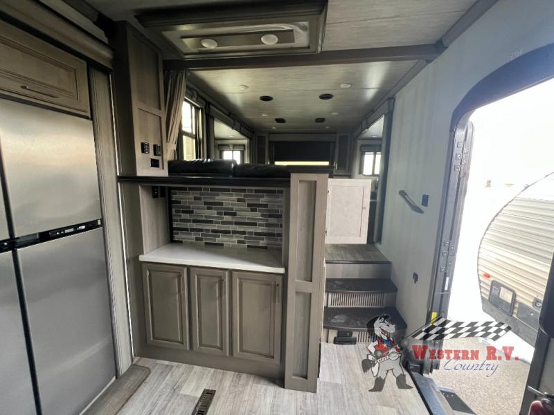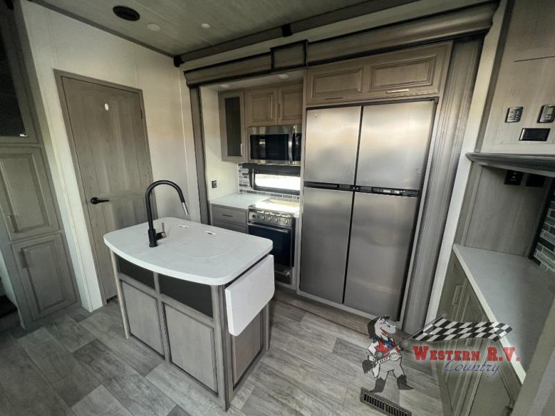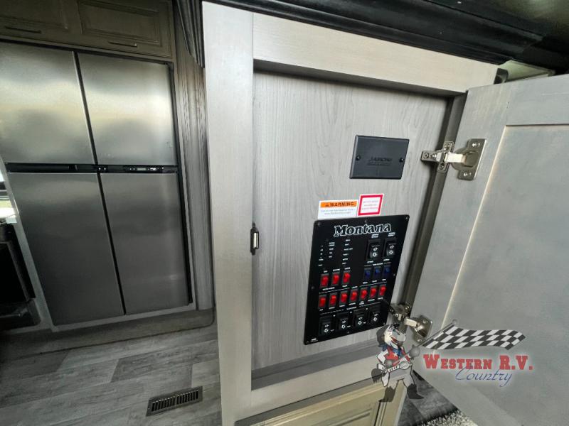 The Montana 3760FL features five slide-outs, significantly enhancing the living space and providing an open, airy feel. Inside, you'll find a thoughtfully designed layout that includes a spacious front living area, complete with plush seating and a large entertainment center. The kitchen is equipped with modern appliances and ample storage, ensuring you have everything you need for gourmet meals on the road. The master bedroom offers a serene retreat with a comfortable bed and additional storage options, while the bathroom provides all the amenities necessary for a comfortable stay.