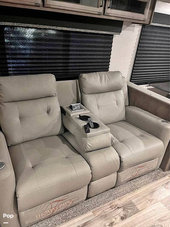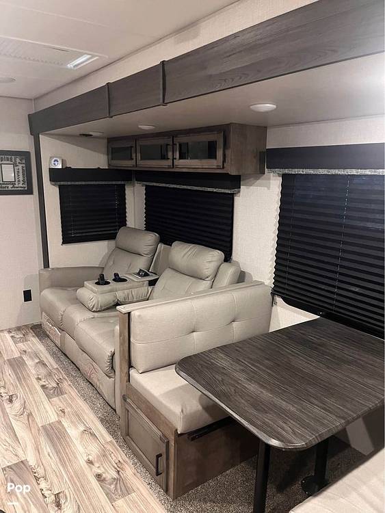 Step inside to discover a thoughtfully laid-out living space featuring modern amenities and high-quality finishes. The well-equipped kitchen includes a refrigerator, microwave, and stove, allowing you to prepare meals with ease. The cozy dinette and plush seating area provide a comfortable space for dining and relaxation. The sleeping arrangements are versatile, with a queen-sized bed, convertible sofa, and dinette that transforms into additional sleeping space, ensuring everyone has a restful night's sleep.