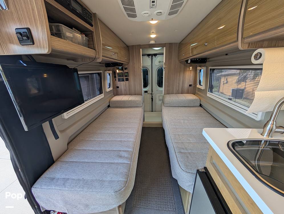 Inside, you'll find a thoughtfully designed interior that maximizes every square meter. The Travato 59K features a fully equipped kitchen with a refrigerator, microwave, and two-burner stove, ensuring you can prepare meals with ease. The spacious wet bath includes a shower, toilet, and sink, providing all the conveniences of home. The interior is elegantly appointed with high-quality materials and finishes, creating a warm and inviting atmosphere. Storage is abundant, with cleverly designed compartments to keep your belongings organized and accessible.