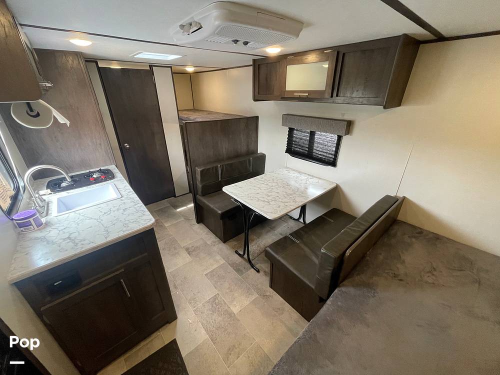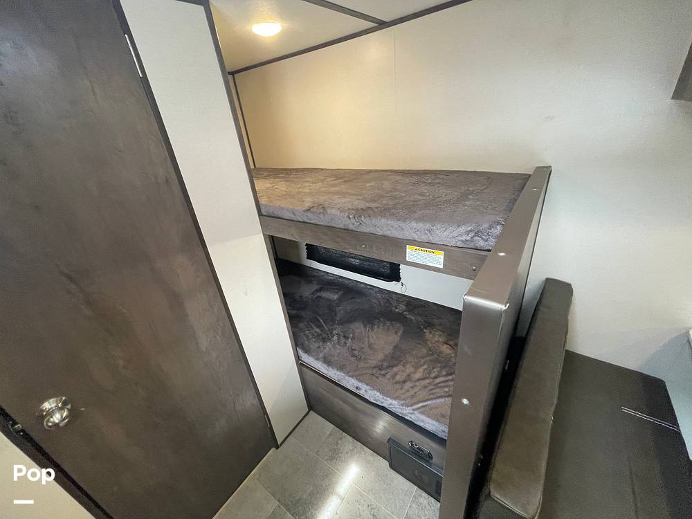 Inside, you'll find a smart layout that can comfortably sleep up to six people. Perfect for families or a group of friends, it features a cozy queen bed, two bunk beds, and a convertible dinette that turns into an extra sleeping space. The interior is thoughtfully designed to maximize space and comfort, ensuring everyone has a place to relax after a day of adventure. The kitchen comes equipped with all the essentials, including a fridge, microwave, and a two-burner cooktop, so you can whip up your favorite meals on the go.