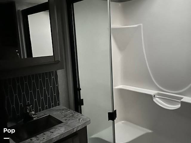 Step inside and you'll find a beautifully designed interior that feels just like home. The living area is perfect for relaxing after a day of exploring, with plush seating and a modern entertainment system. The kitchen is fully equipped with everything you need to whip up your favorite meals, featuring a fridge, stove, and plenty of counter space. The bedroom offers a peaceful retreat with a comfortable bed and ample storage for all your belongings.