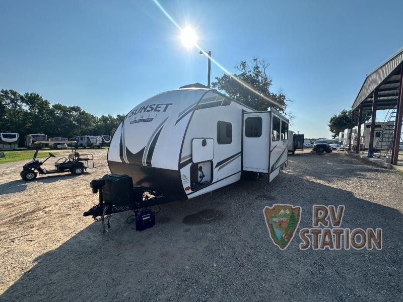 Step inside to discover a thoughtfully designed interior that combines elegance with functionality. The Sunset Trail 253RB features a well-appointed kitchen equipped with state-of-the-art appliances, including a refrigerator, microwave, and a three-burner stove, all seamlessly integrated into a stylish layout. The living area is adorned with plush seating and a dinette, providing a cozy atmosphere for dining and relaxation. The master bedroom offers a serene retreat with a queen-sized bed, ensuring restful nights after a day of exploration. Additionally, the spacious bathroom, complete with a modern shower and ample storage, enhances the overall convenience of this travel trailer.
