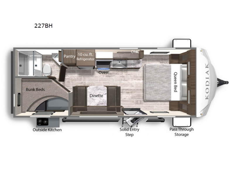 Weighing approximately 1,969 kilograms, the Kodiak Ultra-Lite 227BH is designed for easy towing, ensuring a smooth journey to your destination. Its lightweight construction does not sacrifice durability, providing a robust and reliable travel companion for all your adventures. The thoughtful layout maximizes space, featuring a cozy sleeping area, a well-equipped kitchenette, and a functional bathroom, ensuring all the comforts of home are readily available on the road.