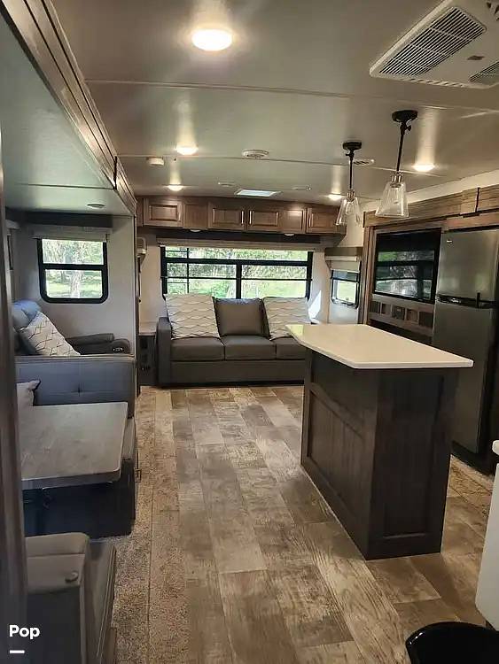 Step inside to discover a thoughtfully designed interior that maximizes space and comfort. The living area features plush seating arrangements, including a convertible sofa and a dinette that easily transforms into additional sleeping quarters. The well-appointed kitchen is equipped with modern appliances, including a refrigerator, microwave, and stove, allowing you to prepare meals with ease. The master bedroom offers a private retreat with a comfortable queen-sized bed, while the additional sleeping areas ensure everyone has a cozy place to rest.