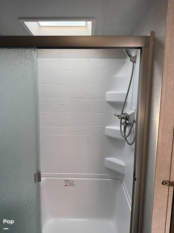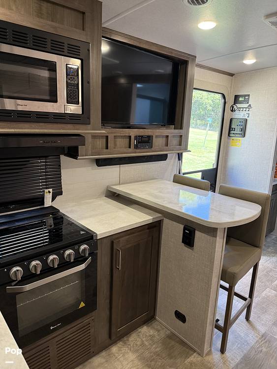 Step inside to discover a well-appointed living space that includes a fully equipped kitchen, complete with modern appliances and ample storage. The dining area provides a comfortable setting for meals, while the plush seating in the living area invites relaxation after a day of exploration. The sleeping arrangements are thoughtfully designed, featuring a queen-sized bed and a convertible sofa bed, ensuring a restful night's sleep for all occupants. The bathroom is equipped with a shower, sink, and toilet, providing the convenience of home on the road.