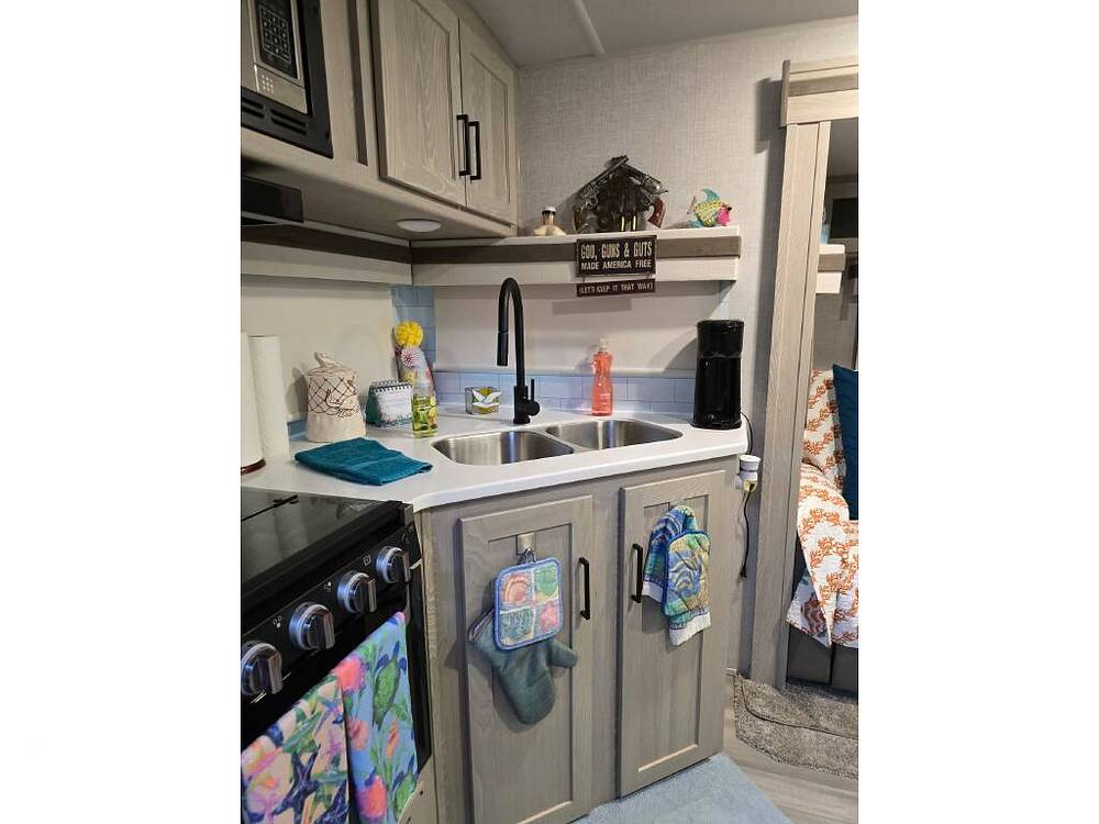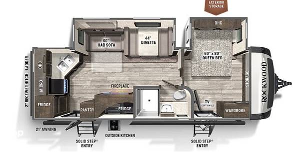 Step inside to find a thoughtfully designed living space that maximizes comfort and functionality. The Rockwood 2614BS features a cozy sleeping arrangement, including a queen-sized bed, convertible sofa, and a dinette that transforms into additional sleeping space. The fully-equipped kitchen comes with modern appliances, ample counter space, and plenty of storage, ensuring you can prepare meals with ease. The bathroom offers a roomy shower and all the amenities needed for a comfortable stay.