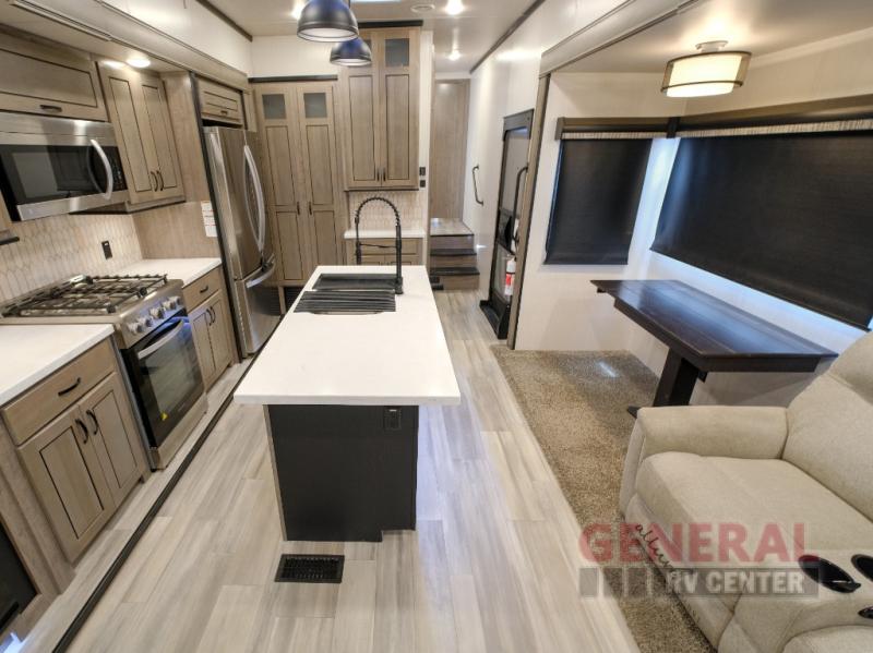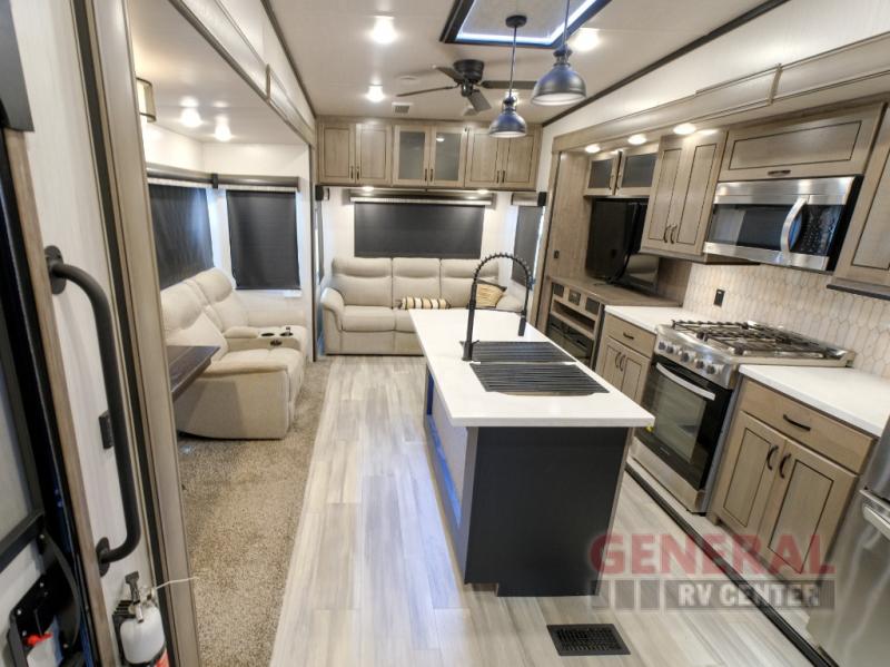 This model features three slide-outs, significantly enhancing the living space and providing a roomy interior that comfortably accommodates up to four people. The Cedar Creek 345IK is thoughtfully designed with a focus on quality and functionality, ensuring a seamless blend of style and practicality. The interior boasts high-end finishes and modern amenities, creating a welcoming atmosphere that feels like home. Whether you're hosting guests or enjoying a quiet evening, the spacious living area and well-equipped kitchen provide everything you need for a comfortable stay.