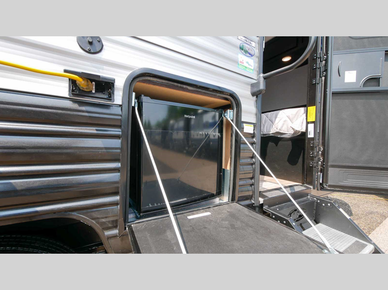 Step inside and experience a thoughtfully designed interior that comfortably sleeps up to three people. The cozy sleeping arrangements ensure restful nights after a day of exploration. The intelligently laid-out living space includes a well-equipped kitchenette, complete with a refrigerator, microwave, and two-burner cooktop, allowing you to prepare your favorite meals with ease. The dinette area provides a comfortable spot for dining or relaxing, while large windows offer panoramic views of your surroundings, bringing the beauty of nature right into your living space.
