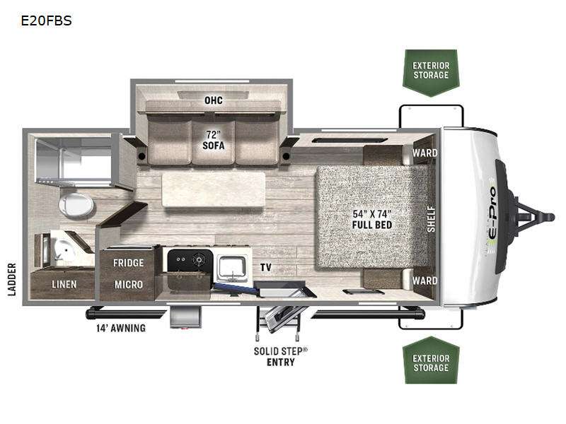 Inside, you'll find accommodations for up to four people, making it perfect for family trips or a getaway with friends. The interior is thoughtfully designed with modern amenities and quality finishes, ensuring you have everything you need for a comfortable stay. Whether you're cooking up a meal in the well-equipped kitchen or unwinding after a day of adventure, the Flagstaff E-Pro E20FBS offers the perfect blend of convenience and comfort. Don't miss out on the opportunity to own this fantastic travel trailer and start making memories on the road today!