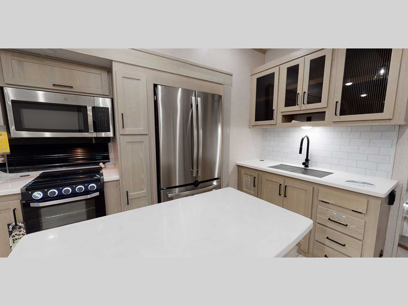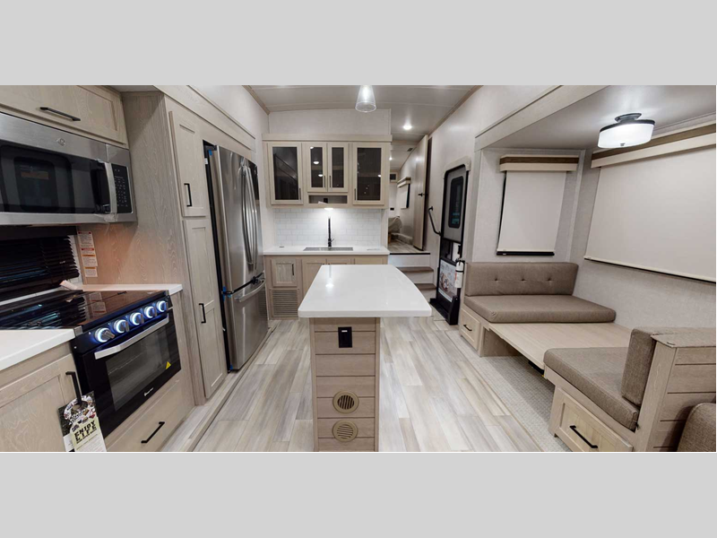 Step inside and you'll find a roomy interior with all the comforts of home. The living area features plush seating and a large flat-screen TV, perfect for movie nights or just relaxing after a day of exploring. The kitchen is a dream, equipped with a refrigerator, microwave, and a three-burner stove, all set to whip up your favorite meals. Plus, there's plenty of storage space for all your travel essentials.