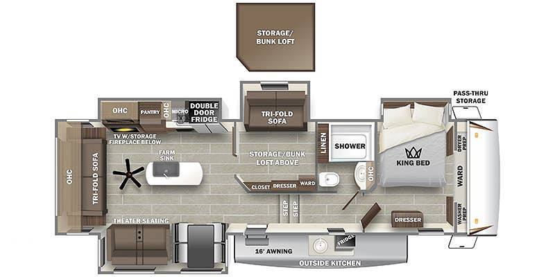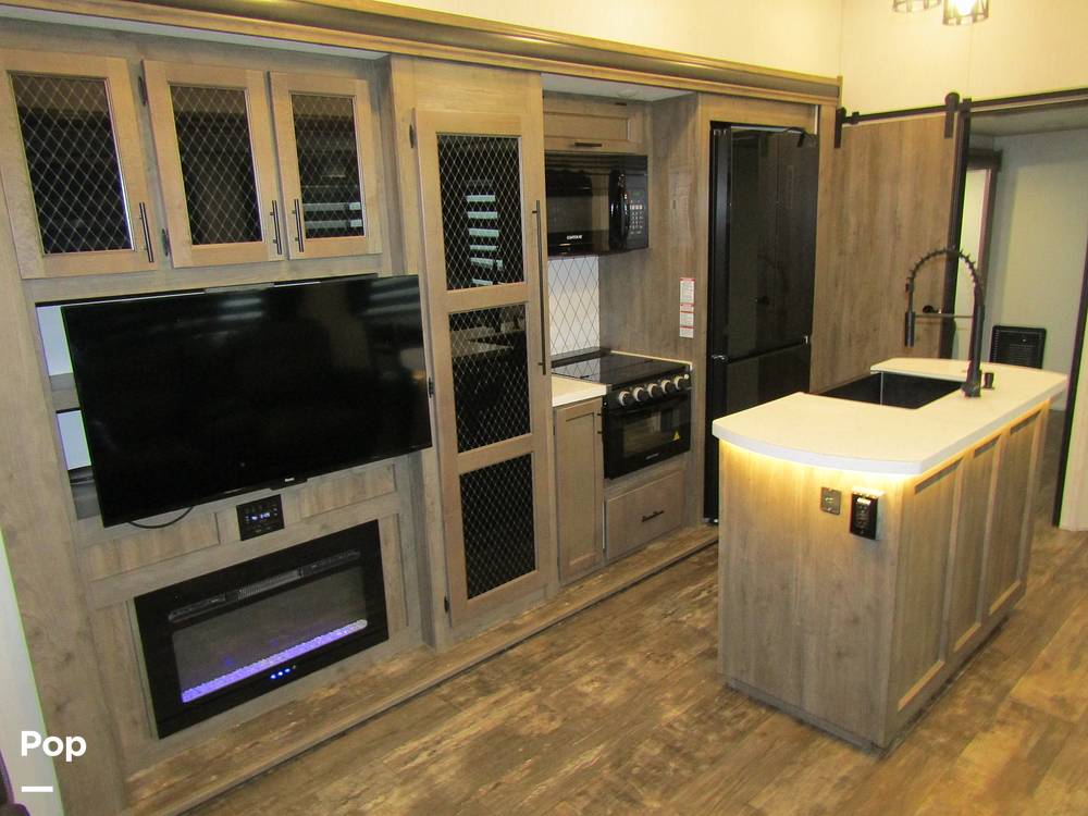 Measuring an impressive 35 feet in length, this Fifth Wheel is designed to maximize space and functionality. Inside, you'll find a thoughtfully designed layout featuring a cozy living area, a fully equipped kitchen, and a private master bedroom. The additional bunkhouse provides extra sleeping quarters, making it ideal for families with children or guests. With high-quality finishes and modern amenities, including a large refrigerator, microwave, and entertainment system, you'll feel right at home no matter where your travels take you.