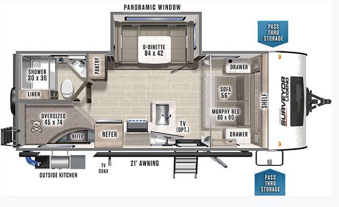 Step inside to find a thoughtfully designed living space that maximizes comfort and convenience. The Surveyor 240BHLE features a modern kitchen equipped with all the essentials, including a refrigerator, microwave, and stove, ensuring you can prepare meals with ease. The cozy sleeping arrangements include a queen-sized bed, bunk beds, and convertible seating areas, providing ample space for everyone to rest and recharge. The stylish bathroom offers a shower, sink, and toilet, ensuring all the comforts of home are at your fingertips.
