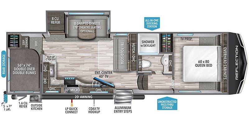 The sleeping arrangements are versatile and comfortable, with a master bedroom featuring a queen-sized bed, bunk beds for the kids, and additional convertible sleeping spaces to accommodate everyone. The bathroom is well-appointed with a shower, sink, and toilet, providing all the comforts of home. With its robust construction and high-quality materials, the 2022 Forest River Reflection 150 SERIES 278BH Fifth Wheel is built to last and ready to accompany you on countless adventures. Experience the freedom of the open road with this remarkable RV, where every journey becomes a cherished memory.