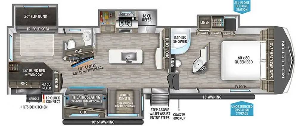 Step inside to find a thoughtfully designed interior that combines style and functionality. The Reflection 311BHS features a well-appointed kitchen with modern appliances, ensuring you can prepare meals with ease. The cozy living area is perfect for unwinding after a day of exploration, while the separate bunkhouse provides a private retreat for the kids or guests. With multiple sleeping options, including a master bedroom with a queen bed, this RV ensures everyone has a comfortable place to rest.