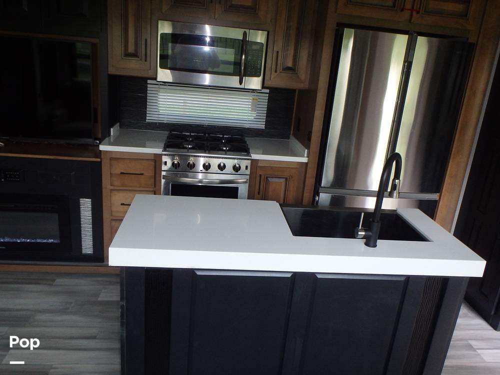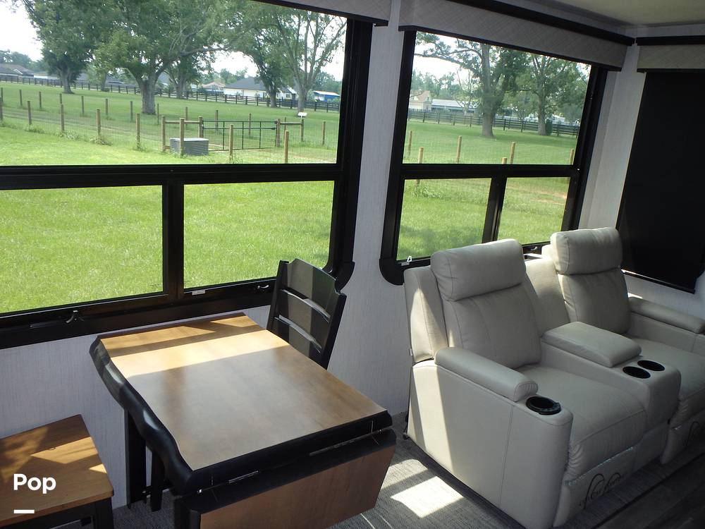 Step inside to find a meticulously crafted living area, featuring high-end finishes and modern amenities. The open-plan design includes a fully equipped kitchen with state-of-the-art appliances, a cozy dining area, and a plush seating arrangement that invites you to unwind after a day of exploration. The master suite offers a tranquil retreat with a king-sized bed and an en-suite bathroom, complete with a luxurious shower and ample storage. An additional half bath ensures convenience for all guests, enhancing the overall comfort of this remarkable RV.