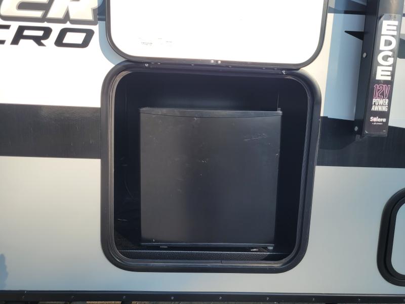Step inside to discover a thoughtfully laid-out interior that maximizes space and functionality. The living area is equipped with a plush seating arrangement, ensuring relaxation after a day of exploration. The well-appointed kitchen features modern appliances, including a refrigerator, microwave, and a two-burner stove, all designed to make meal preparation a breeze. The sleeping area offers a cozy retreat with a comfortable bed, promising restful nights under the stars. Ample storage solutions throughout the trailer ensure that all your travel essentials are neatly organized and easily accessible.