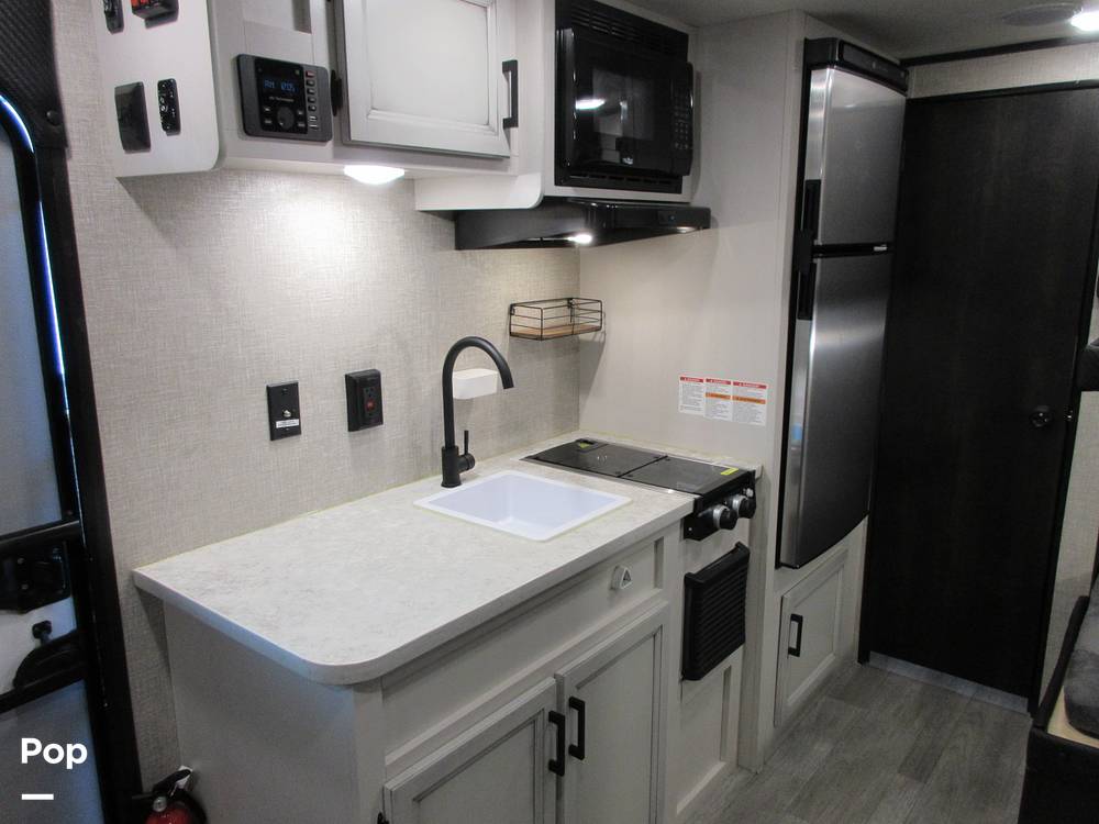 Inside, you'll find a thoughtfully designed layout that maximizes every square meter of space. The sleeping arrangements include a cozy queen bed, a convertible dinette, and bunk beds, ensuring everyone has a comfortable place to rest. The well-equipped kitchen features a two-burner cooktop, microwave, and refrigerator, allowing you to prepare meals with ease. The bathroom includes a shower and toilet, providing the convenience of home wherever you go. Ample storage solutions throughout the trailer ensure you can bring along all your essentials for a memorable trip.