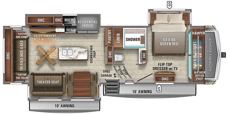 Step inside to find a beautifully crafted interior that comfortably sleeps four, making it ideal for families or couples seeking adventure. The North Point 310RLTS boasts a sophisticated living area with plush seating, a state-of-the-art entertainment system, and ample storage space, ensuring you have everything you need for a relaxing journey. The fully equipped kitchen features modern appliances and elegant finishes, allowing you to prepare gourmet meals with ease. Meanwhile, the cozy bedroom offers a serene escape with a luxurious queen-sized bed and plenty of wardrobe space.