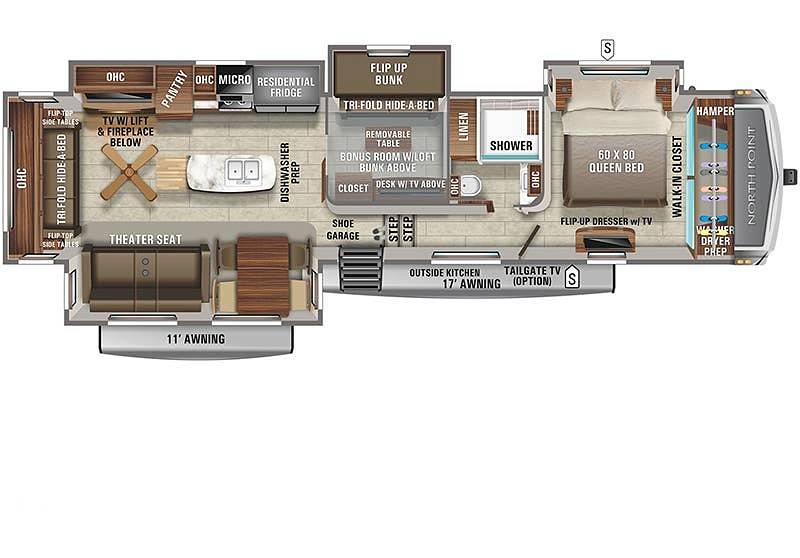 Step inside to discover a thoughtfully designed interior that combines elegance with functionality. The North Point 377RLBH features a well-appointed living area, complete with plush seating and a state-of-the-art entertainment system, providing a cozy atmosphere for unwinding after a day of exploration. The fully equipped kitchen boasts modern appliances, ample counter space, and a dining area, making meal preparation a breeze. The RV's sleeping arrangements include a master bedroom with a queen-size bed, a loft, and additional convertible sleeping spaces, ensuring everyone has a comfortable place to rest.
