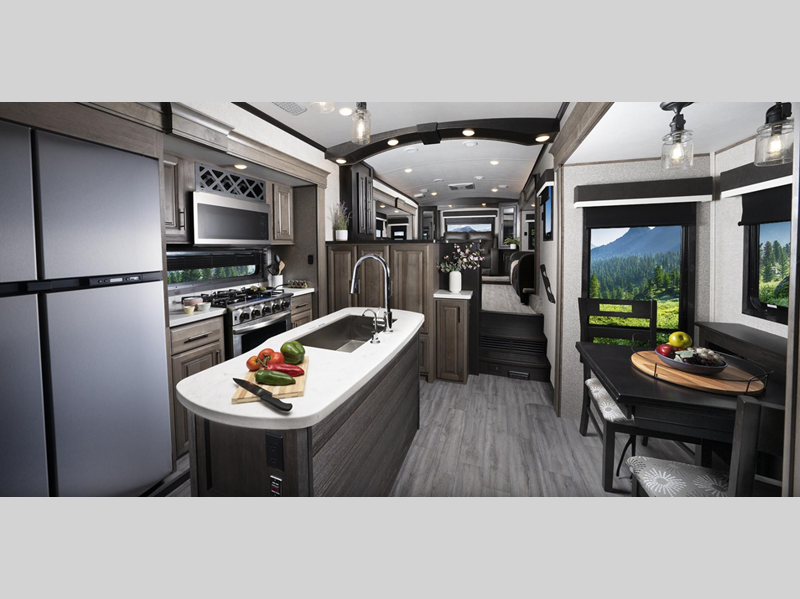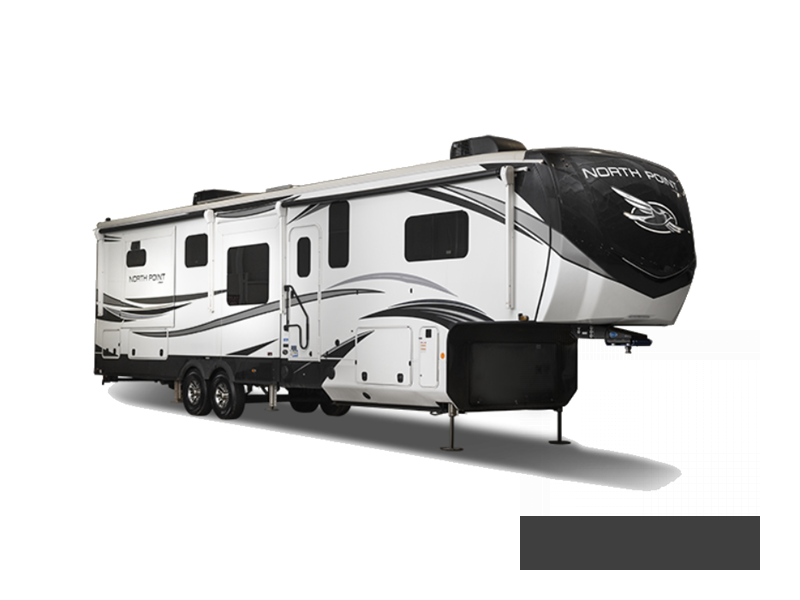 Featuring five slide-outs, the North Point 382FLRB provides an expansive living space that can comfortably sleep up to six people. The intelligently designed layout includes a cozy front living area, perfect for relaxing after a day of exploration. The fully equipped kitchen boasts modern appliances and ample counter space, making meal preparation a breeze. The luxurious master suite offers a private retreat with a plush bed and plenty of storage, ensuring a restful night's sleep.