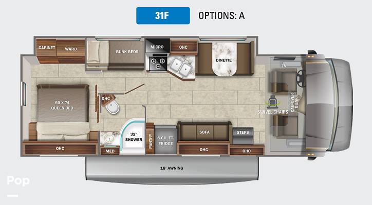 Step inside and be greeted by a thoughtfully designed interior that maximizes space and comfort. The Redhawk 31F features a fully equipped kitchen with modern appliances, including a refrigerator, microwave, and three-burner cooktop, making meal preparation a breeze. The cozy dining area is perfect for family meals or game nights, while the inviting living space offers plush seating and a flat-screen TV for entertainment on the go. The RV's smart layout includes plenty of storage options, ensuring all your travel essentials are within easy reach.
