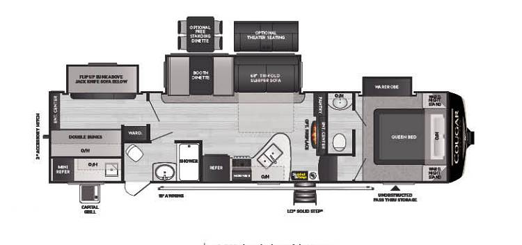 The interior of the Keystone Cougar 32BHS is thoughtfully designed to maximize space and convenience. It features a well-equipped kitchen with modern appliances, ample storage, and a dining area that comfortably accommodates your group. The living area is inviting, with plush seating and entertainment options to keep everyone engaged. The sleeping arrangements include a master bedroom with a queen-sized bed, bunk beds, and convertible sleeping spaces, ensuring a restful night for all.
