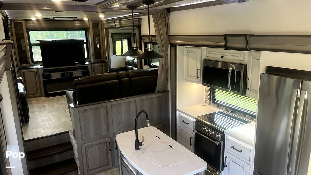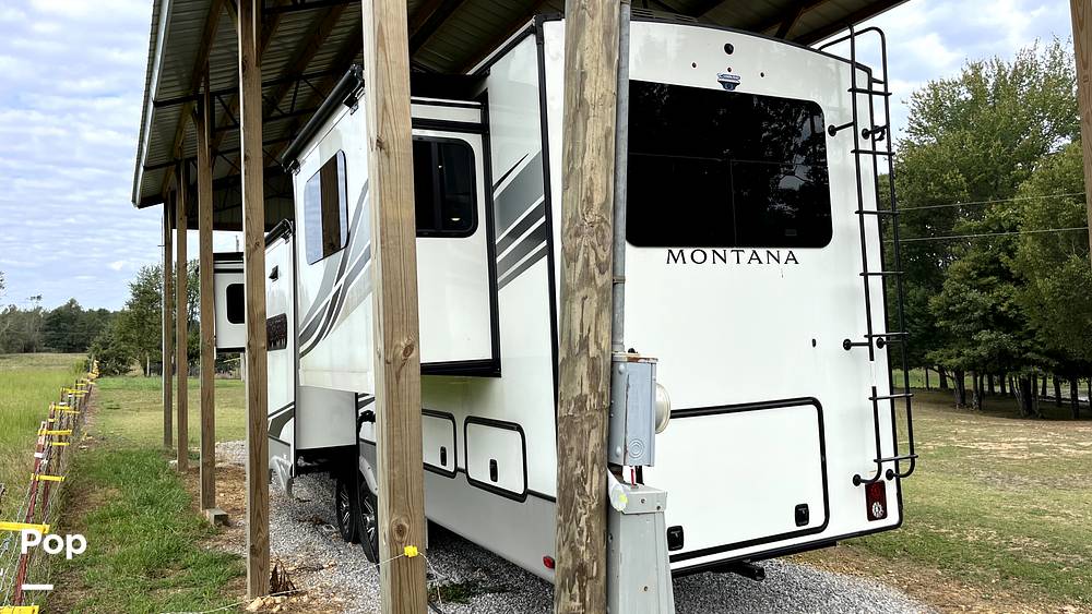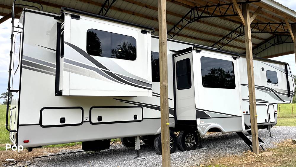 Step inside to discover a thoughtfully designed interior that exudes elegance and sophistication. The living area features plush seating arrangements, perfect for socializing or enjoying a quiet evening. The well-appointed kitchen is equipped with modern appliances, including a refrigerator, stove, and microwave, allowing you to prepare meals with ease. The dining area provides a cozy space for enjoying meals together, while large windows offer panoramic views of your surroundings. The Montana 3791RD also boasts a spacious bathroom with a shower, ensuring convenience and comfort during your travels.