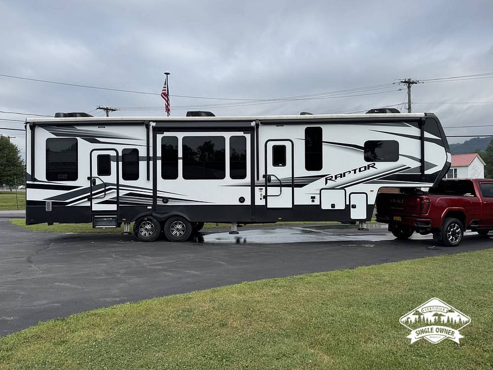Introducing the 2022 Keystone Raptor 352 Fifth Wheel, a remarkable blend of luxury, comfort, and functionality designed to elevate your travel experiences. This meticulously crafted RV, measuring an impressive 33 feet in length, is the epitome of modern design and engineering excellence. With the capacity to comfortably sleep up to seven individuals, it is the ideal choice for families or groups seeking adventure without compromising on comfort.