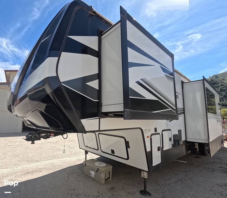 Measuring an impressive 36 feet in length, this fifth wheel offers ample space for relaxation and entertainment. The interior is meticulously crafted, featuring high-quality materials and modern amenities that ensure a comfortable and enjoyable experience. The spacious living area is perfect for socializing, while the well-appointed kitchen provides all the necessary appliances for preparing delicious meals on the go. The sleeping quarters are designed to offer restful nights, with plush bedding and ample storage space for personal belongings.