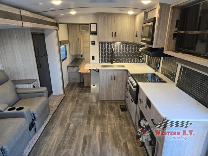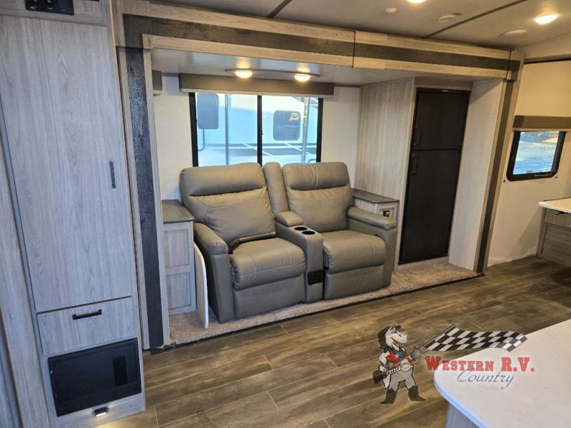 Step inside to find a beautifully designed interior featuring a cozy living area, complete with a plush sofa and a dinette that easily converts into additional sleeping space. The well-equipped kitchen boasts a three-burner stove, a large refrigerator, and ample counter space, ensuring you can whip up your favorite meals on the go. The private bedroom offers a comfortable queen-sized bed, plenty of storage, and a tranquil atmosphere for restful nights. The spacious bathroom, with its modern fixtures and roomy shower, adds an extra touch of luxury to your travels.