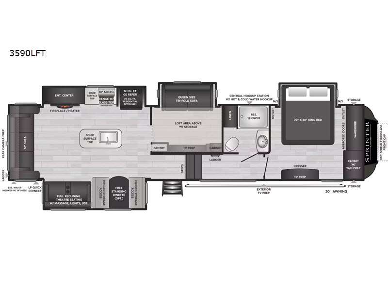 Discover the ultimate in comfort and convenience with the 2022 Keystone RV Sprinter Limited 3590LFT Fifth Wheel. This spacious RV is designed for families and groups, offering ample room with its four slide-outs. Measuring 32 feet in length, it provides a generous living space that can comfortably sleep up to eight people, making it perfect for family adventures or trips with friends.