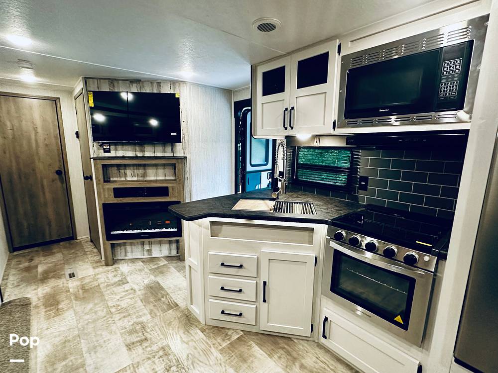 Inside, you'll find a thoughtfully designed layout that can comfortably sleep up to 11 people. The master bedroom provides a cozy retreat with a queen-sized bed, while the bunkhouse is a dream come true for kids, featuring multiple bunks and a fun space to call their own. The living area is equipped with a plush sofa and a dinette that easily converts into additional sleeping space. The fully-equipped kitchen boasts modern appliances, including a refrigerator, microwave, and stove, ensuring you can whip up delicious meals on the go.