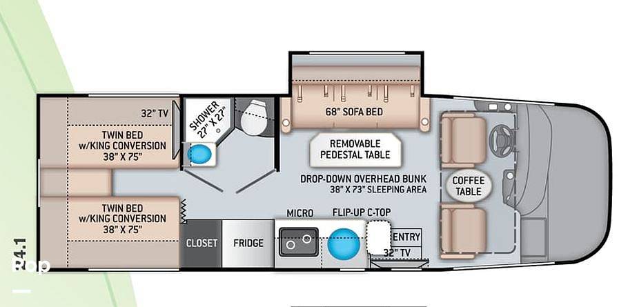 Inside, the Axis 24.1 boasts a meticulously designed interior that optimizes space and utility. The living area is thoughtfully arranged to provide a welcoming atmosphere, featuring high-quality furnishings and modern amenities. The sleeping arrangements are versatile, ensuring restful nights with a spacious queen-sized bed, a convertible sofa bed, and an additional sleeping area for one. The fully equipped kitchen, complete with a refrigerator, microwave, and stovetop, allows for convenient meal preparation, while the elegant bathroom offers all the necessities for a refreshing experience on the road.