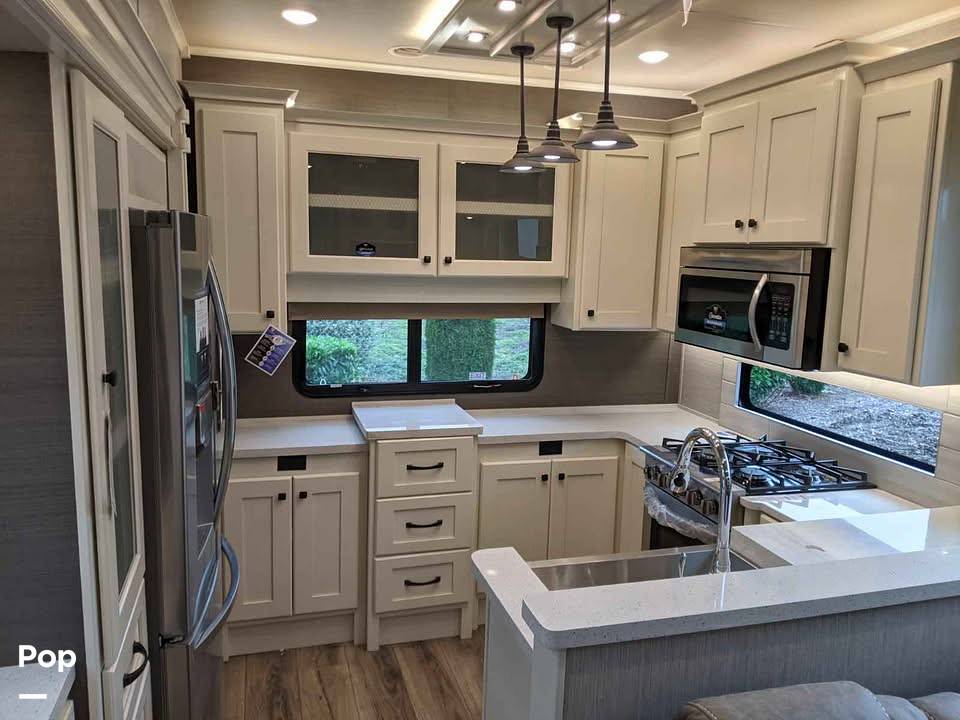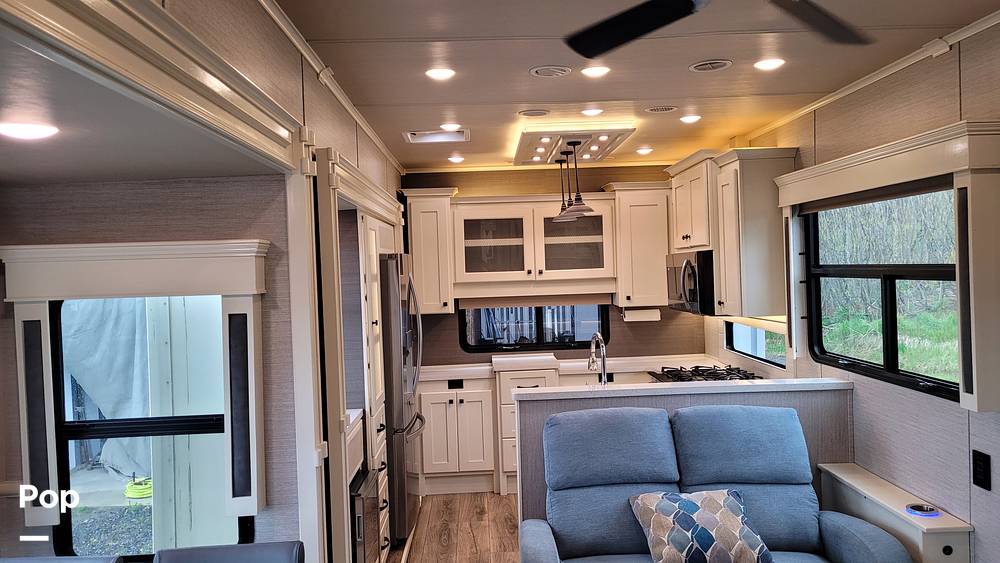 Introducing the 2022 Vanleigh RV Vilano 390LK Fifth Wheel, a luxurious and spacious mobile retreat designed for those who seek comfort and elegance on the road. This meticulously crafted RV offers an exceptional blend of style and functionality, making it an ideal choice for both short getaways and extended adventures. With a length of 35 feet, this fifth wheel provides ample space for relaxation and entertainment, ensuring a comfortable journey for all occupants.