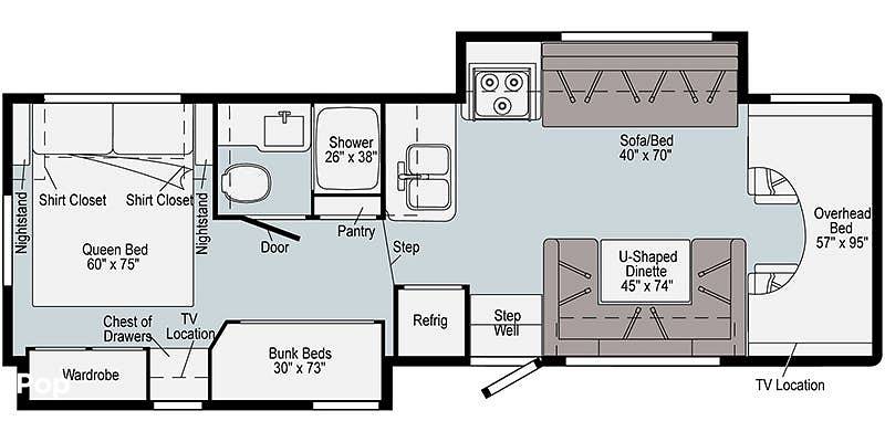 Inside, you'll find a thoughtfully designed layout that maximizes space and utility. The living area is equipped with plush seating and a dinette that easily converts into additional sleeping space. The fully-equipped kitchen features modern appliances, including a refrigerator, microwave, and stove, allowing you to prepare meals with ease. The bathroom offers a shower, toilet, and sink, providing all the conveniences of home. Ample storage throughout the RV ensures that all your belongings are neatly organized and easily accessible.