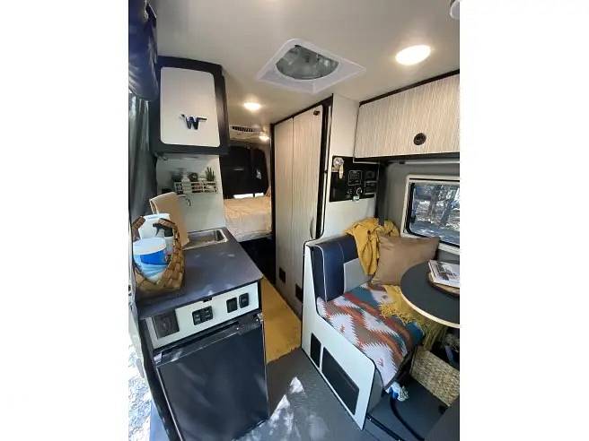 Inside, the Revel is a marvel of efficient design, comfortably sleeping two adventurers. The interior is thoughtfully laid out to maximize space and functionality, featuring a cozy sleeping area that transforms into a comfortable living space during the day. The well-equipped kitchenette includes a refrigerator, induction cooktop, and sink, allowing you to prepare delicious meals wherever you roam. Ample storage solutions ensure you can bring along all your essentials without compromising on comfort.