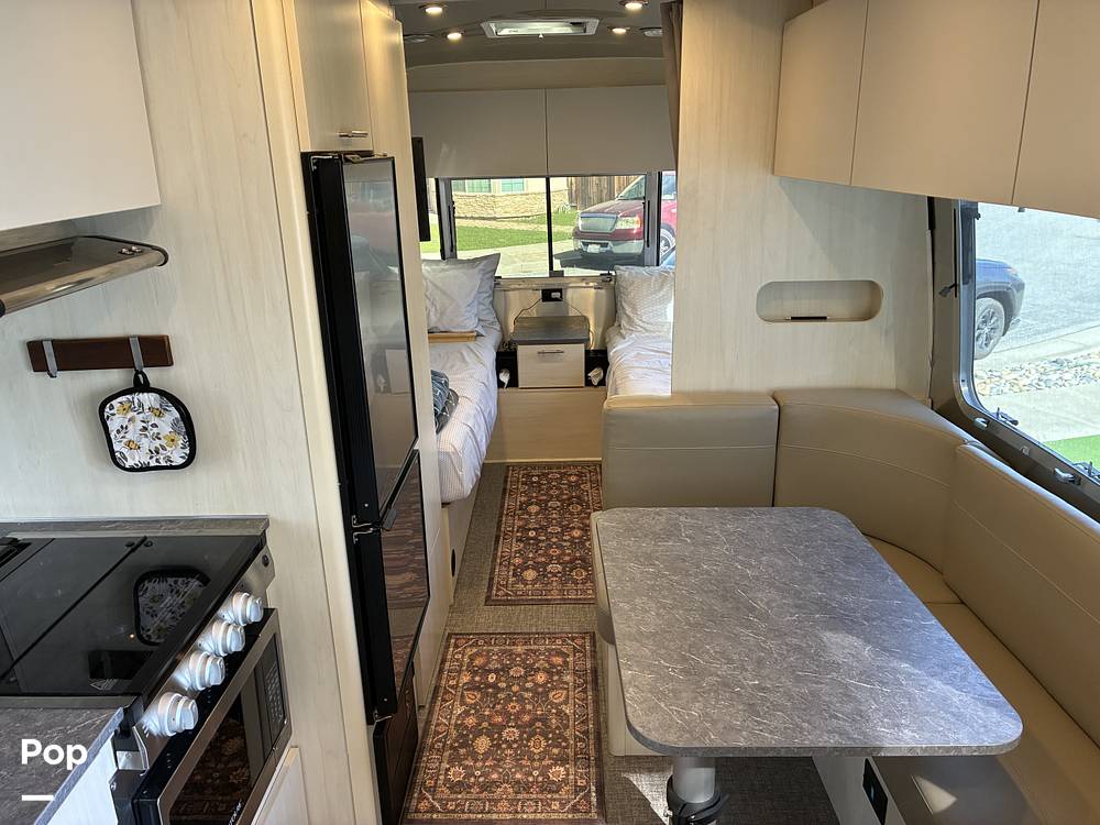Inside, you'll find a cozy setup that can comfortably sleep up to four people. The twin beds are perfect for a good night's sleep, and the convertible dinette offers extra sleeping space for guests or family. The interior is thoughtfully designed with high-quality finishes and clever storage solutions, making it easy to keep everything organized and within reach. The kitchen is equipped with all the essentials, including a stove, microwave, and fridge, so you can whip up your favorite meals on the go.