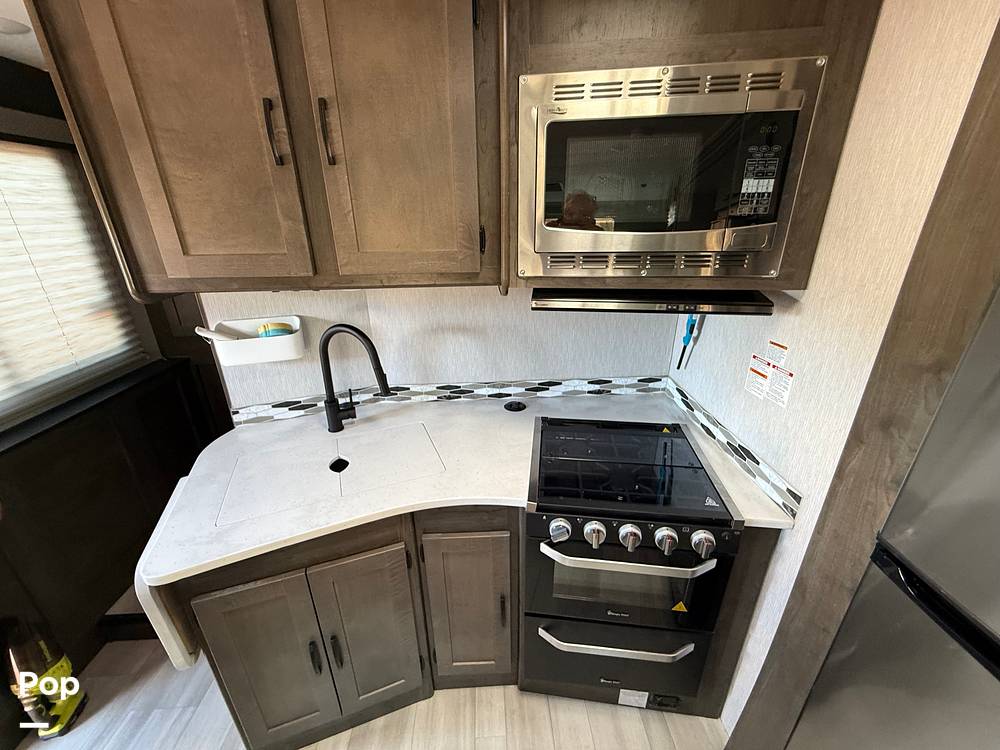 Inside, you'll find a thoughtfully designed interior that maximizes comfort and convenience. The Leprechaun 298KB features a well-equipped kitchen with a refrigerator, microwave, and three-burner stove, allowing you to prepare delicious meals on the go. The cozy sleeping arrangements include a queen-sized bed, convertible dinette, and overhead bunk, ensuring everyone has a comfortable place to rest. The bathroom is complete with a shower, sink, and toilet, providing all the comforts of home while on the road.