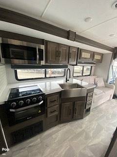 Step inside to discover a meticulously crafted living area that exudes elegance and practicality. The RV features a fully equipped kitchen with modern appliances, including a refrigerator, microwave, and stove, allowing you to prepare meals with ease. The dining area provides a comfortable space for enjoying meals together, while the plush seating in the lounge area invites relaxation after a day of exploration. Sleeping arrangements are versatile and comfortable, with a master bedroom, convertible sofa, and additional sleeping spaces to accommodate your entire group.