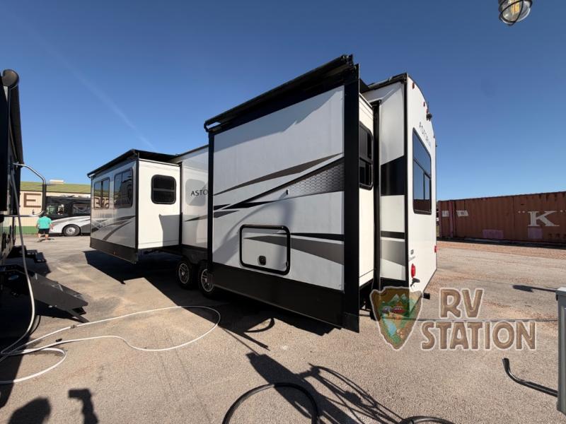 Step inside and be greeted by a spacious interior featuring two slide-outs that expand your living area, providing a roomy and inviting atmosphere. The Astoria comfortably sleeps four, ensuring a restful night's sleep after a day of exploration. The front kitchen layout is both stylish and functional, equipped with top-of-the-line appliances and plenty of counter space for preparing delicious meals on the go. The elegant furnishings and thoughtful design details create a cozy yet sophisticated ambiance that will make every journey memorable.