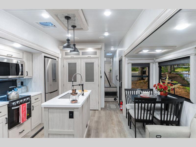 This fifth wheel is engineered to accommodate up to nine people comfortably, making it ideal for family adventures or trips with friends. The intelligently designed floor plan includes multiple sleeping areas, ensuring a restful night's sleep for everyone. The master suite offers a private retreat, while the additional sleeping spaces are perfect for kids or guests. The RV's total weight is approximately 5,895 kilograms, providing a stable and secure ride without compromising on the spaciousness and comfort of the interior.