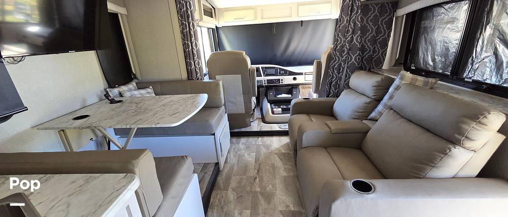 Inside, you'll find a thoughtfully designed interior that maximizes both functionality and comfort. The RV features a fully equipped kitchen with modern appliances, including a refrigerator, microwave, and stove, ensuring you can prepare meals just like at home. The living area is designed for relaxation, with a comfortable seating arrangement and a flat-screen TV for entertainment. Sleeping arrangements are versatile, with a master bedroom, convertible sofa beds, and a dinette that transforms into a bed, ensuring everyone has a cozy place to rest.