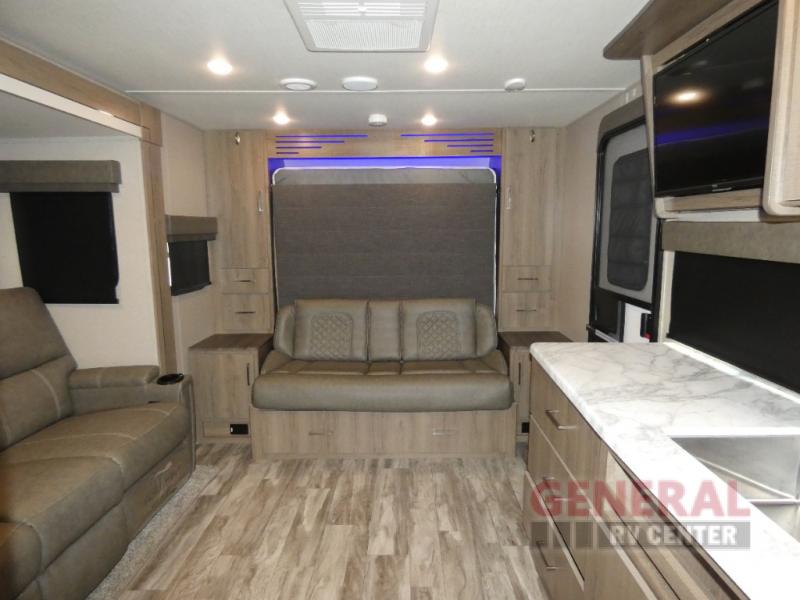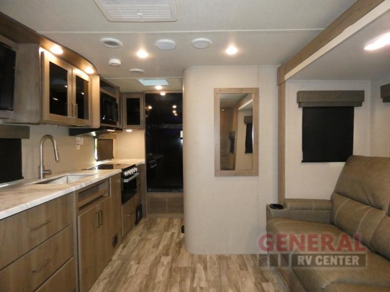 This model features one slide-out, significantly enhancing the interior space to accommodate up to three sleepers comfortably. The intelligently designed floor plan includes a cozy sleeping area, a fully equipped kitchen, and a functional bathroom, ensuring that all your needs are met while on the move. The kitchen comes with essential appliances and ample storage, allowing you to prepare meals with ease. The living area is thoughtfully arranged to maximize space and comfort, making it a perfect spot to relax after a day of exploration.