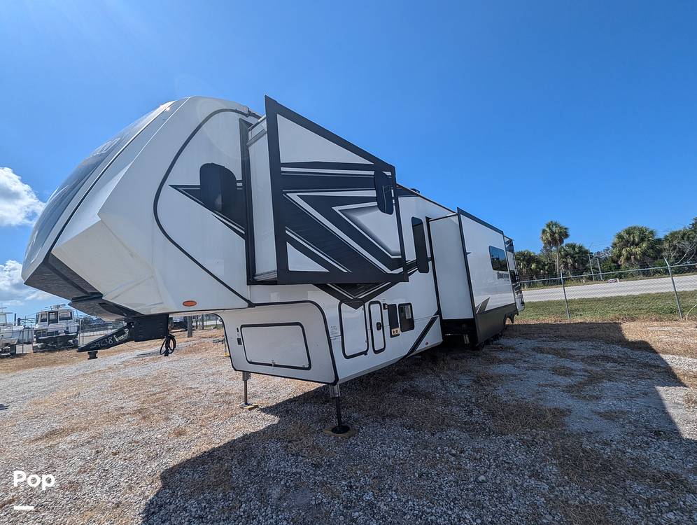 Measuring an impressive 36 feet in length, the Momentum 395MS-R offers a well-thought-out layout that maximizes both living and storage space. The interior is meticulously crafted with high-quality materials and finishes, providing a sophisticated yet welcoming atmosphere. The kitchen is equipped with modern appliances and ample counter space, making meal preparation a breeze. The living area features plush seating and state-of-the-art entertainment options, ensuring relaxation and enjoyment for all occupants.