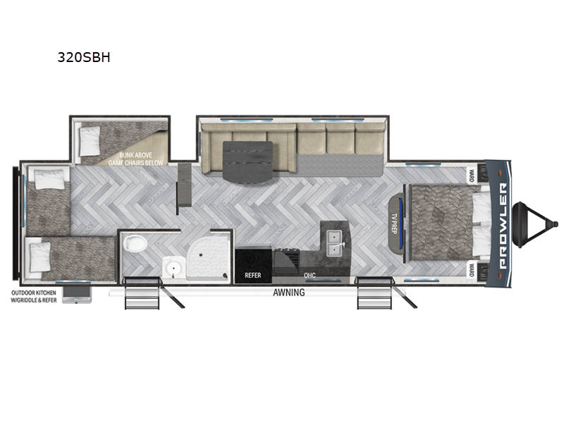 The Heartland Prowler 320SBH features two expansive slide-outs, providing ample living space that can comfortably sleep up to nine people. Whether you're planning a weekend getaway or an extended road trip, this RV ensures everyone has their own cozy spot to relax. The intelligently designed interior includes a fully-equipped kitchen, a welcoming living area, and a private master bedroom, making it easy to enjoy every moment on the road.