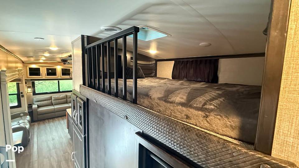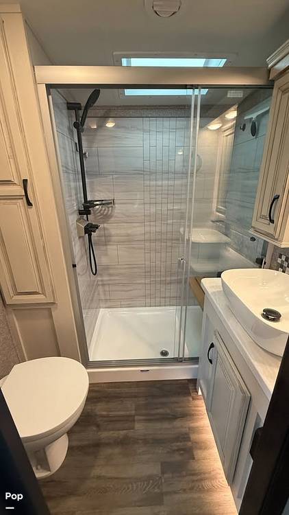 Step inside to find a beautifully appointed interior featuring high-quality finishes and thoughtful design. The living area boasts plush seating and a state-of-the-art entertainment system, perfect for unwinding after a day of exploration. The fully equipped kitchen comes with modern appliances, ample counter space, and a cozy dining area, ensuring you can prepare and enjoy meals just like at home. The RV also includes a versatile bonus room, which can be used as an office, additional sleeping space, or a playroom for the kids.